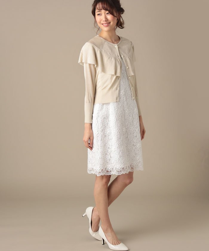 スイートなムード漂うフリル使いがフェミニンな表情を見せてくれるクルーネックニットカーディガン。細身のコンパクトなシルエットが美しいデザイン。シンプルなワンピに重ねて楽しみたい。