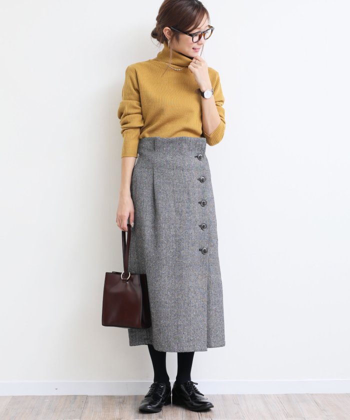 【E−2】ヘリンボーン 前ボタン ハイウエスト タイトスカート