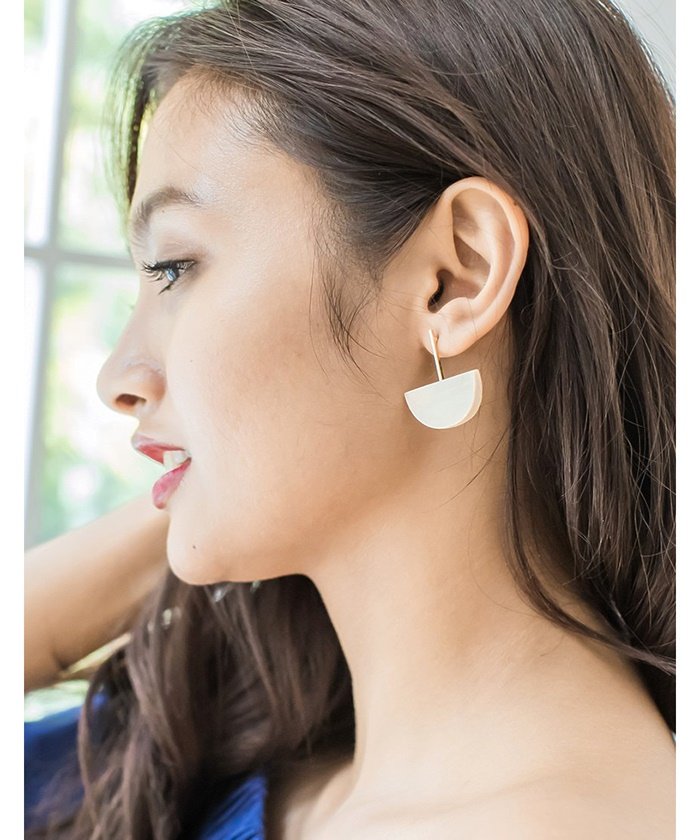 モードな印象のセミサークルモチーフピアス。 シンプルな夏コーデのアクセントにぴったりな色使いにも注目。 夏らしいナチュラルなウッドパーツで、リゾートやビーチにもマッチするアイテムです。 ※天然素材のため、商品により多少色や風合いが異なる場合がございます。予めご了承ください。