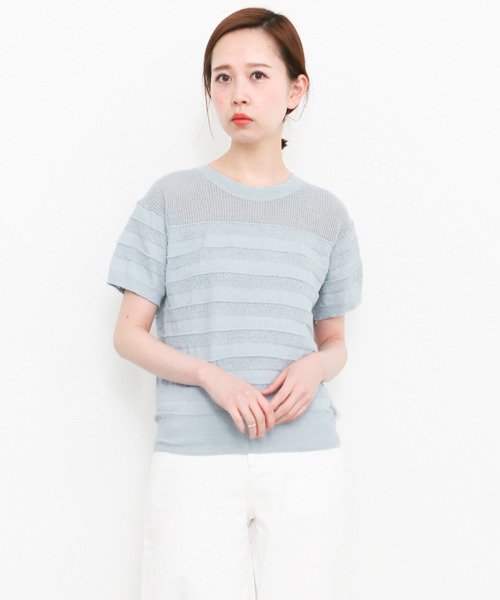 立体感のあるボーダー編みがポイントのサマーニット。麻を含んだ素材は肌触りも見た目も涼しげな印象で真夏まで着まわせる◎バストより上はメッシュ編みになっていて透け感を楽しめるデザイン。タンクトップなどのインナーを透かして可愛いのはもちろん、キャミワンピースの上に重ねたレイヤードスタイルも可愛いです。 ※透け感あり ※素材の特性上、表面が他に引っかかりやすくなっておりますのでお取扱いには充分ご注意ください。 ※この製品は編地の特性上、ゆがみが生じます。そのため、一枚一枚サイズや風合いなどに違いがありますが、これらはこの編地の特徴ですので、他の製品では味わえない良さをお楽しみください。 ※その他お取り扱いに関しましては、商品に付属のアテンションタグをご覧ください。
