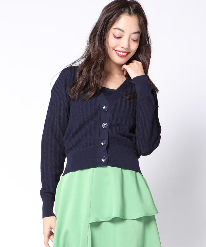 ざっくりとした編み地で透け感を表現した春夏らしいVネックのショートカーディガン。形はベーシックながら全体にヘリンボーンの柄が入り、シンプルすぎないルックスに仕上げています。ドライな質感の強撚糸を使用しているので清涼感があり、今の季節から夏までさらに残暑の残る秋口までの長い期間お使いいただけます。コンパクトな短め丈でスカートスタイルに合わせやすいのがGOOD◎!ワンピースやカットソーの上にさらりと羽織って肌の露出を控えたり、夏場の冷房対策としても使えるカーディガンは鞄に一枚あると便利です。もちろん手洗いOKでご家庭でケアできるのがうれしいですね♪