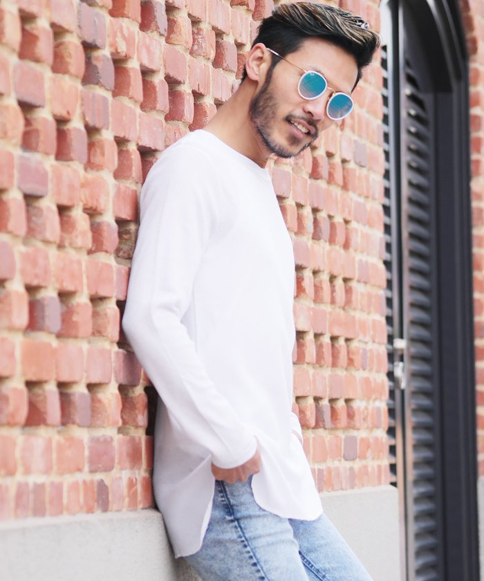 ラウンドヘムスリットロングサーマルTシャツ ワッフル サーマル 生地の ロング丈 長袖 Tシャツ 無地 ロンT カットソー♪ シンプル 無地 で爽やかな ワッフル生地 クルーネック ロング丈Tシャツ は今期のオシャレに最適! 首元は アクセサリー が映える クルーネック デザイン★これ1枚でも ジャケット や シャツ の インナー や ベスト などと合わせるだけで コーデ が決まります♪ カラーは コーディネートに必須な ブラック ホワイト 杢グレー ボーダー の定番人気 全4色をご用意!! 今期も引き続き人気の衰えないロング丈はレイヤードスタイルにも欠かせないアイテム。