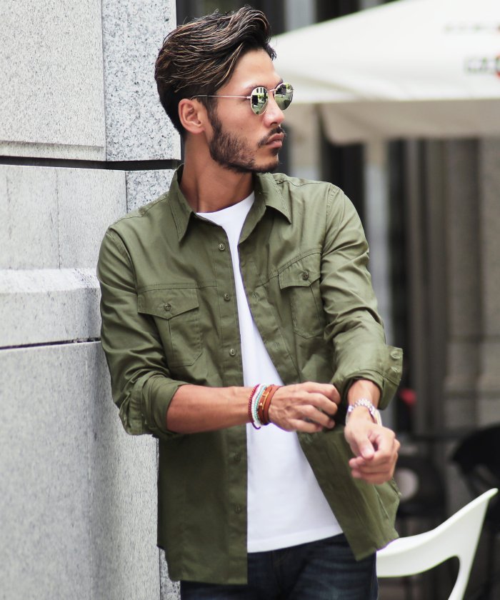 roshell(ロシェル) ストレッチブロードミリタリーシャツ ミリタリーのディティールをプラス! ベーシックなブロードシャツにミリタリーの要素を加えた新感覚のメンズカジュアルシャツ。 両胸に施されたフラップポケットがしっかりとしたシャツの風合いをカジュアルダウンしてくれ、デニムやチノパンと合わせても他のものとは差をつけれるこなれたスタイリングを演出してくれます。 ストレスフリーな伸縮性! キレイなシルエットを作りだす秘密はボディーラーインに沿った裁断がされているため。体のラインに沿ってフィットする美シルエットを実現しました。 更に、横方向への伸縮が大きなストレッチブロード素材を使用することで動きづらさを解消。 日常の動きで、その稼働域が最も求められる背中部分への効果は絶大。腕の上げ降ろしやウエスト部分への順応性も大きく、気持ち良く着て頂ける仕上がりに。 「メンズのお洒落は我慢」なんて言わせないストレスフリーなストレッチシャツです。