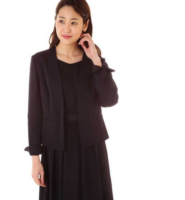 【送料無料】 滑らかな肌触りの上質な素材のエレガントなノーカラージャケットです。すっきり着こなせるよう深めに開いたVネックがポイントです。今年トレンドのクラシカルなボウタイブラウスやタートルネックをインナーに用いてもバランス良く着こなせます。ビジネスシーンやお出かけの際、活躍する一着です。同素材のボトムとセットアップで揃えて頂けます。 ナチュラルビューティー/NATURAL BEAUTY ジャケット・スーツ|その他