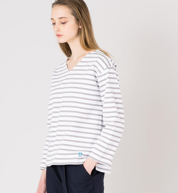 【送料無料】 オーシバルを代表する素材の一つ、コットンロードシリーズのVネックTシャツ。適度にゆとりをもたせたルーズシルエットなので、一枚での着用でも様になり、ニュアンス感のあるスタイリングを叶えます。オープンエンド(空紡糸)という糸で編まれた軽くて丈夫な生地が特徴で、カットソーには珍しく経年変化を楽しめる点も魅力です。※ソリッドカラーの展開もございます。(品番:RC-9116-8S-SO)※この製品は生地の特性上、洗い方や回数にもよりますが、通常の家庭洗濯で、着丈・身幅共に若干縮みます。お買い求めの際はサイズにご注意ください。ECRU/MARINE(Nat):ECRU/MARINE (エクリュ/ネイビー)GREY系1 (グレー系その他):WHITE/CLOUD (ホワイト/ライトグレー)【ORCIVAL(オーシバル)】1939年にフランス・リヨンで設立したマリンウェア・ブランド。1950年代?60年代にはフランス海軍の制服としてボーダーTシャツを提供していた。現在も定番のラッセル生地はフランスに数台しかない縦編み機で作り続けている素材を使用している。 ビショップ/Bshop ORCIVAL|トップス|Tシャツ・カットソー