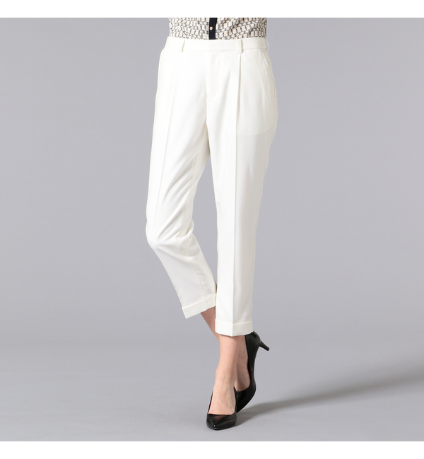 【送料無料】 フォーマルな印象の仕立ての良いテーパードクロップドパンツ。表地にはしなやかなレーヨン混の素材を使用。ストレッチが効いているのではき心地はストレスフリーです。センタープレスをかけたキレイ目なパンツですので、プライベートからオフィスまで対応できる汎用性の広さも魅力の一つ。同素材のテーラードジャケットのご用意もあるので、スーツとしても着用して頂けます。尚、こちらのパンツは透けにくい裏地を裾口まで使用しています。ホワイトボトム特有の悩みにも可能な限り配慮した一本となっていますトルソー:H172 B80 W58.5 H86 着用サイズ:36 ギルドプライム/GUILD PRIME パンツ|その他